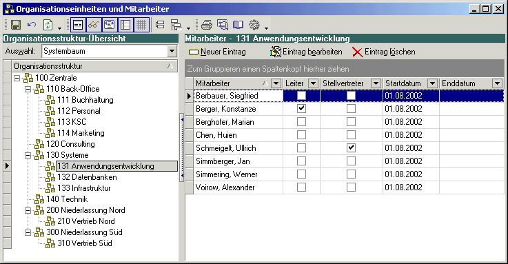 Zuordnung der Mitarbeiter zur links aktuell gewählten Organisationseinheit